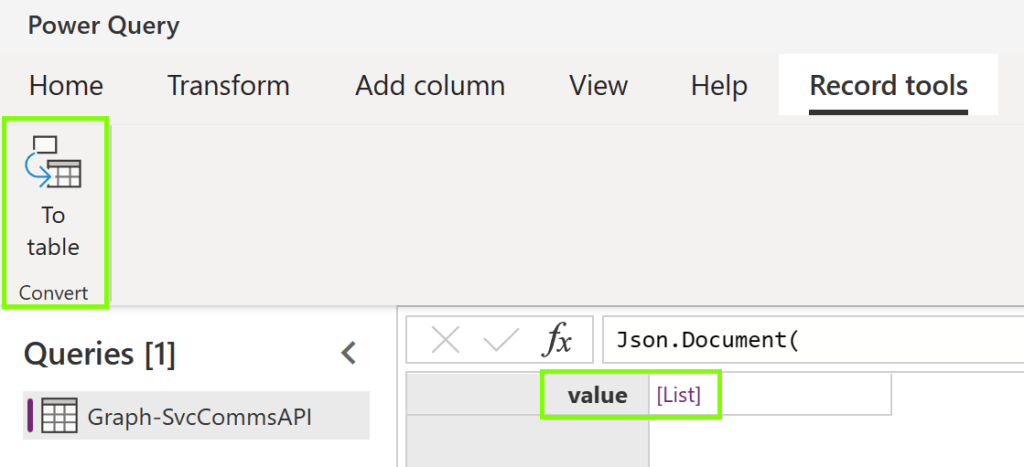To easily understand what columns my table needed, I pulled up the example response for the Service Communications API in Docs. Similar example responses can be found for most other Graph API requests, and I warmly recommend making use of them. They’ll save you a lot of time!