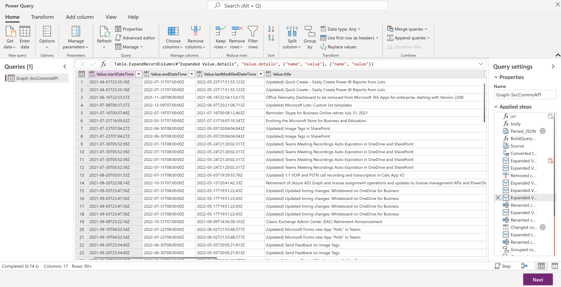 After expanding all of the available columns, I ended up with a situation like the one below, where I had multiple rows with the same Service Comms message title. This is because each fetched Service Comms message title can have multiple other List-type attributes, such as Tags and Services. When all of these attributes are expanded, each unique Title + Tag + Service combination gets its own row.