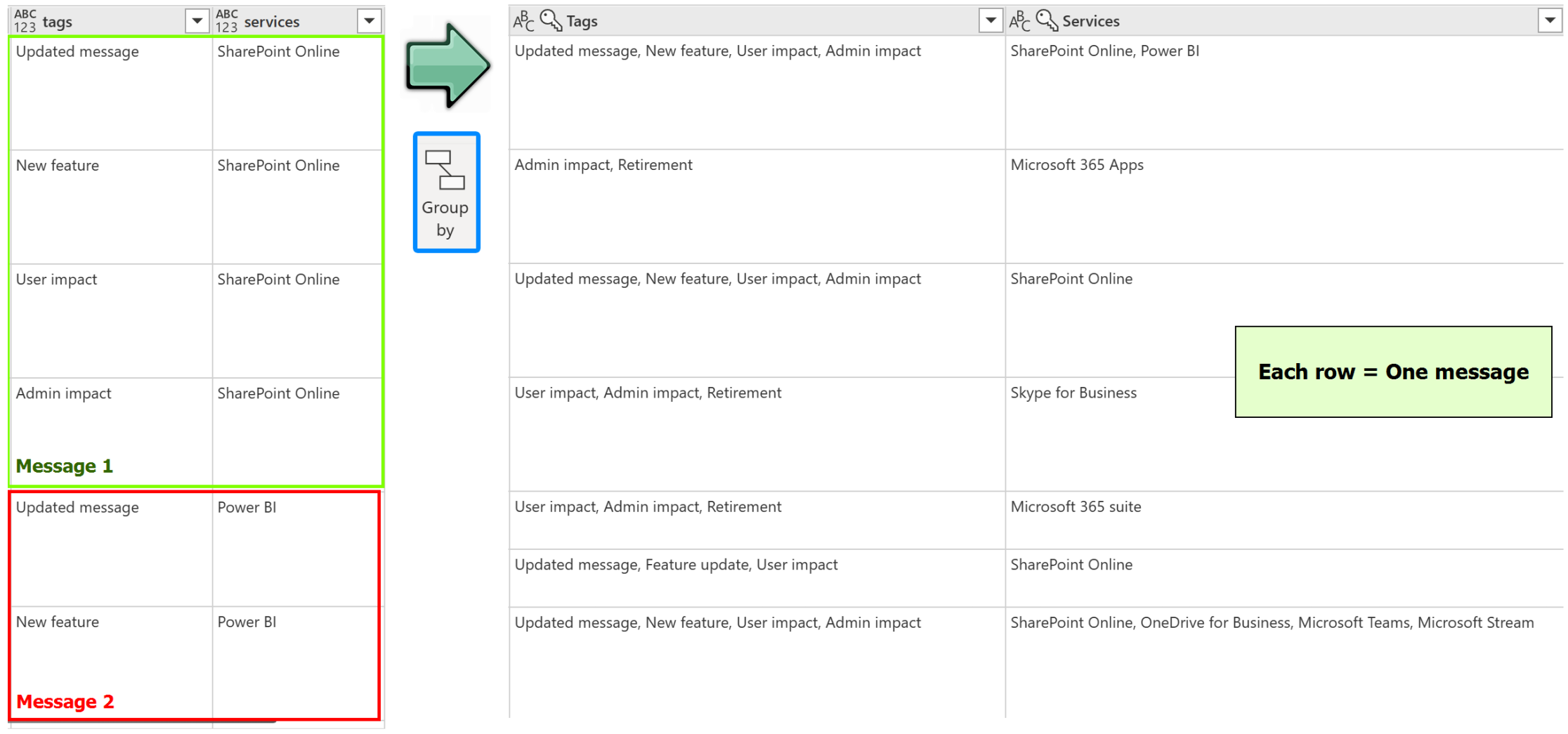 To solve this, we’ll need to do a few back-to-back Group by operations. I basically used this route to combine all the list-based attributes of each unique message so I can have only one row for each unique message stored in Dataverse.