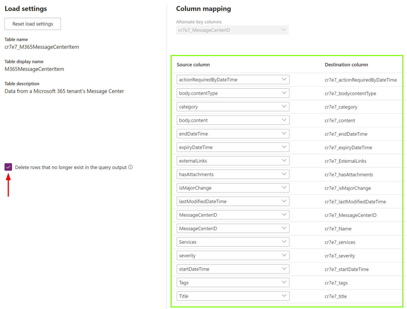 If you do this yourself, take a moment to think whether you want to retain in Dataverse any unique rows that were once but are no longer returned from your API endpoint. If not, you should choose to Delete rows that no longer exist in the query output, like I did.