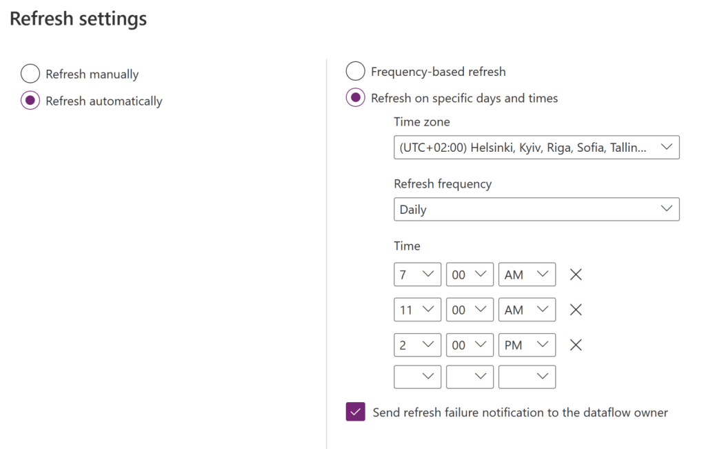 Dataflows support scheduled and incremental refresh cycles, giving you flexibility in how often you fetch and update data in your destination storage location. This is great, because in my case I only really benefit from setting Graph API data to be fetched a few times per day at certain hours.