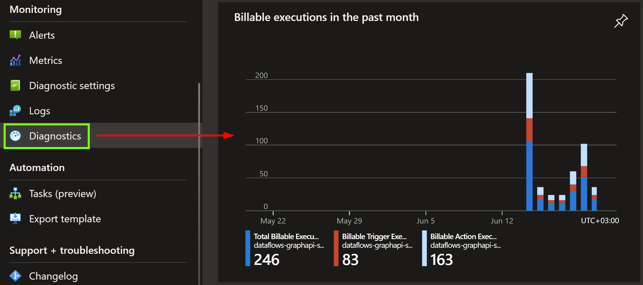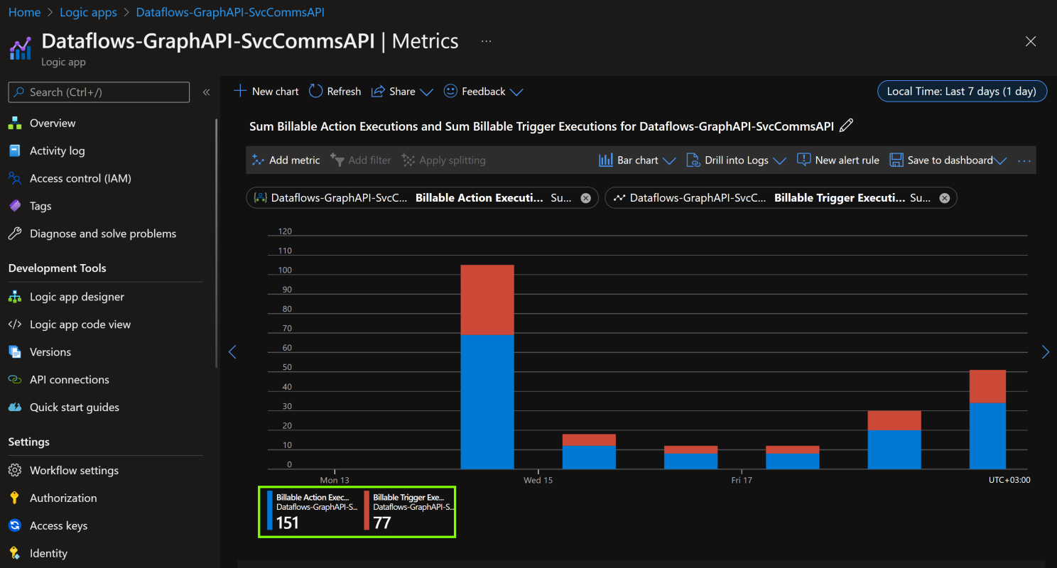 You can also monitor things from the Logic Apps end by checking out the run history and metrics for your Logic App. I especially recommend using the Metrics for your Logic App with the Bar chart view and looking at Billable Action and Trigger executions with a time range of 7-30 days and a time granularity of 1 day. This will help you get an easy idea of how different refresh configurations translate into Logic Apps consumption.