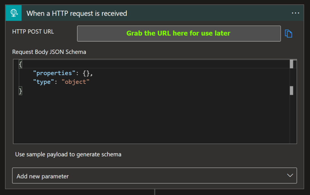 For the trigger, I used When a HTTP request is received and defined a minimal schema. It’s important to note the HTTP POST URL that is generated after saving the workflow at this point. In practical terms, we are creating a callable endpoint for later use here.