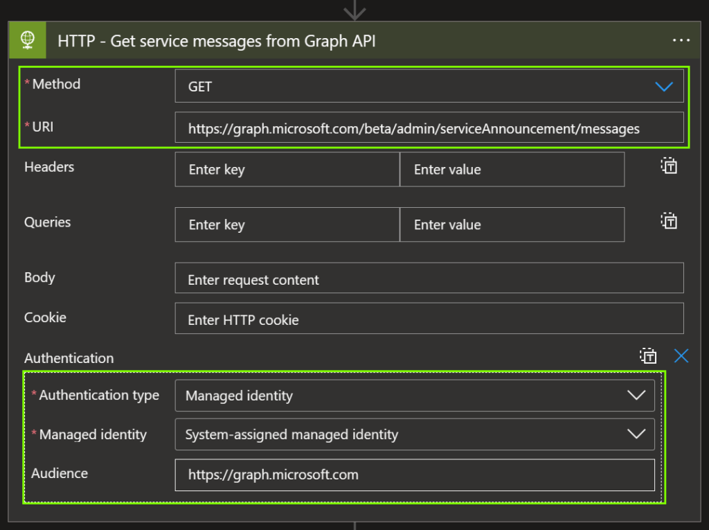 The first action – an HTTP GET call to the Graph API. Note the highlighted parts in the image below: authentication is handled with the managed identity and no secrets are passed.