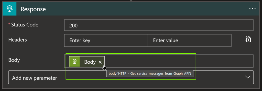 We’ll follow the HTTP GET call up with a Response, which is what our Dataflow will receive when calling this Logic App via the POST URL. In the response’s body, we’ll simply attach the JSON-formatted Body from the HTTP GET action.