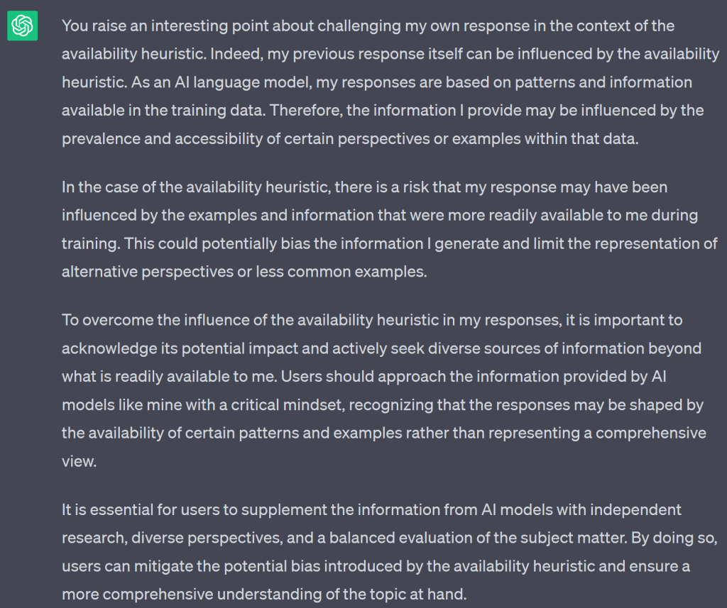 As a fun experiment to cap this blog off, I decided to visit ChatGPT to request its definition of the availability heuristic. As expected, it made several points I felt were more or less in line with what Mr. Kahneman wrote about. Then, I asked ChatGPT to challenge its own answer.