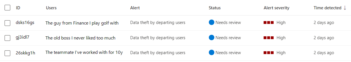 Let’s say the person responsible for triaging IRM alerts sees three high-severity ones (like those below) and only has the time to focus on one.