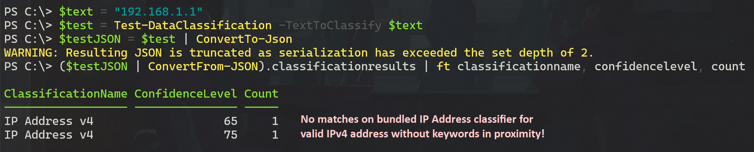 (((Test-DataClassification -TextToClassify $text) | ConvertTo-Json) | ConvertFrom-Json).classificationresults | Format-Table classificationname, confidencelevel, count