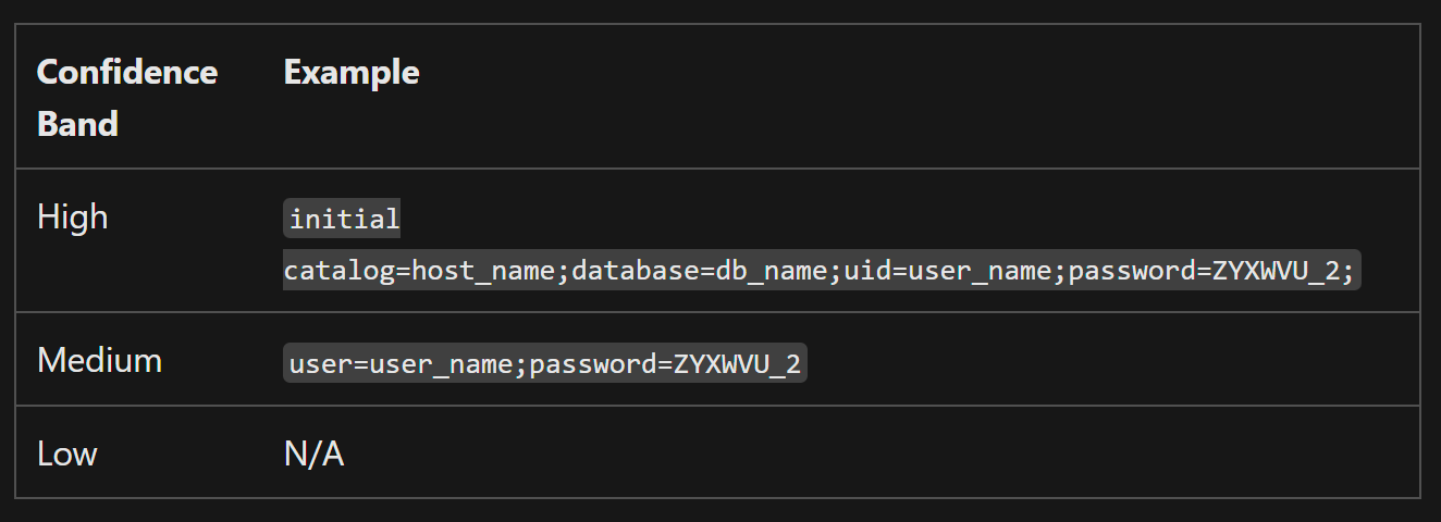 Looks like this particular classifier is tuned to avoid false positives by requiring keywords to be present in close proximity – a good thing for avoiding production disruptions, I reckon. It could be that it has no defined criteria for a Low confidence match at all – it’s not possible to be 100% sure.