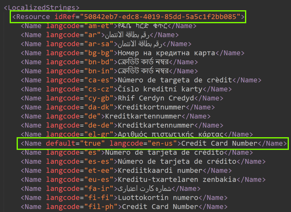 Localized names and descriptions for each SIT – Matched to SIT definitions using their unique identifier, highlighted in the image below along with the default classifier name in English.