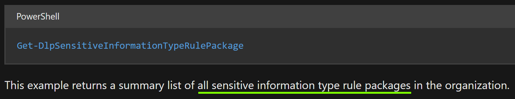 To access the contents of a rule pack, fire up the Security and Compliance PowerShell and follow Step 1 from this documentation to export the pack’s contents to an XML file. In this case, we want to pull the data for the pack called the Microsoft Rule Package.