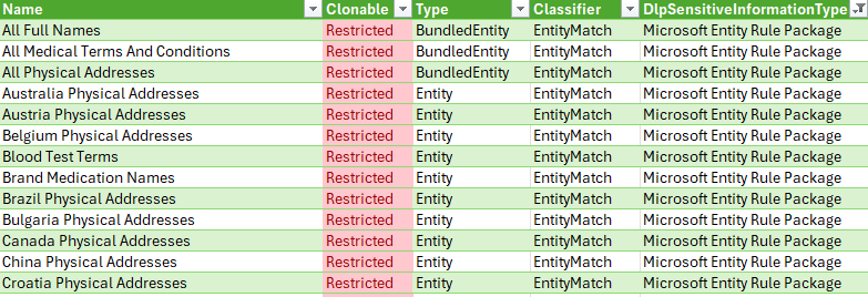 If you want to see which sensitive information types these two rule packs contain, you can dump the data for all classifiers into a CSV file with..