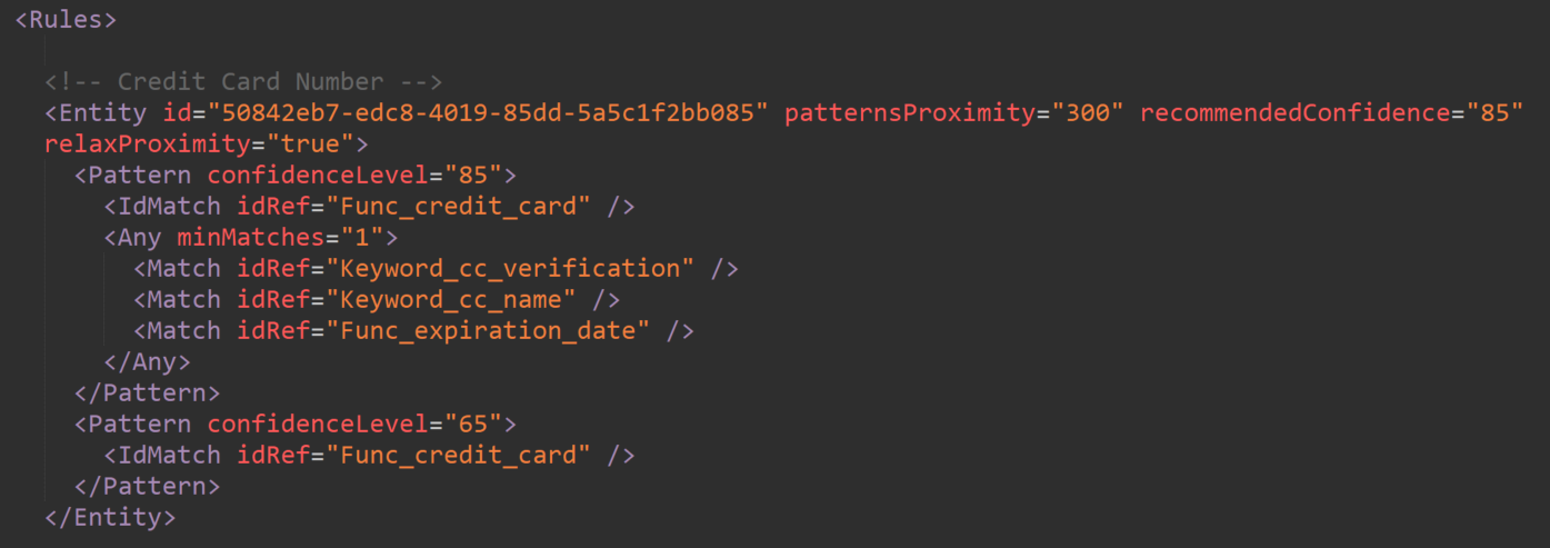 Microsoft doesn’t allow closer scrutiny or export of either the entity or credential scanner rule packages. Because of this, we have no direct access to the exact confidence level criteria for the SITs they contain.