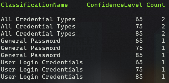An example of the output is below. The string I tested was found to contain two High confidence matches against the All Credential Types bundled SIT – one for General Password and one for User Login Credentials.